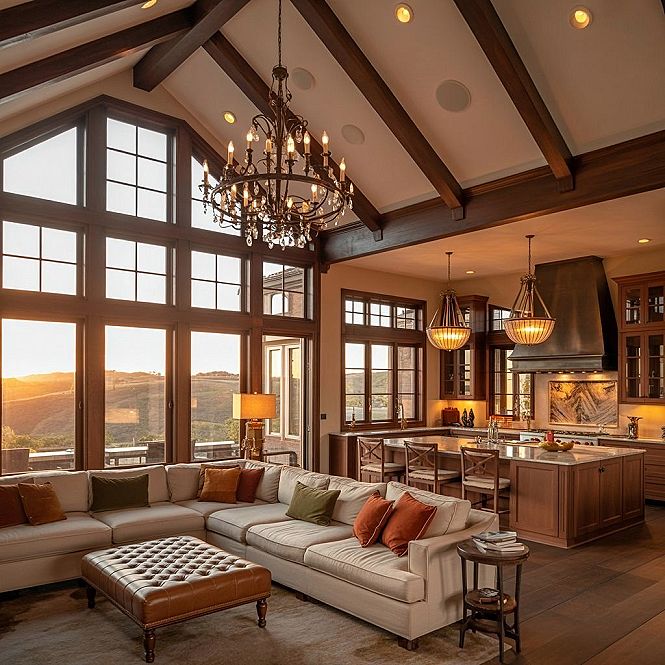 Massive windows frame serene views, bathing the space in natural light and complementing the ‘great room color schemes’ for a luxurious blend of rustic charm and elegant design in your ‘Dream House Pictures’.