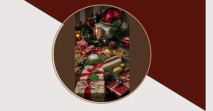 This picture is like a Christmas explosion! It’s got everything you need to make your room feel super festive. Presents wrapped in all sorts of awesome patterns, sparkly ornaments, and even a giant, glowing red bauble that looks like it could be from a fancy Christmas tree in a palace!