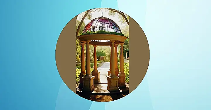 This picture shows a super fancy gazebo with a roof made of stained glass. It looks like something straight out of a fairytale! It’s kind of like a secret garden hidden away in a beautiful, sunny spot. The way the light shines through the glass must make everything inside sparkle like a million tiny rainbows.