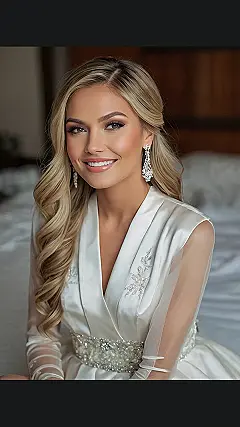 This bride is looking absolutely stunning, with a hairstyle that’s as dreamy as her wedding day. Her hair is styled in soft waves that cascade down her shoulders, looking like a princess from a fairy tale. But the real star of the show is her makeup. It’s like the perfect blend of natural beauty and a touch of glam. Her eyes sparkle, her skin glows, and her lips are painted a beautiful shade of pink that makes her smile even more dazzling.