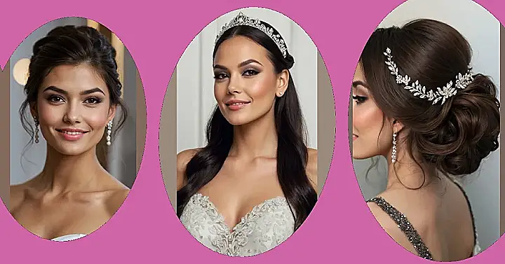 This picture shows a bride-to-be with a beautiful hairstyle. It’s all about the details, like the sparkly headpiece that makes her hair look like a crown. It’s like she’s a princess stepping out of a fairytale! The hairdo itself looks so elegant and intricate, like someone spent hours making it perfect. I’m not sure I could sit still that long, but maybe that’s just me!
