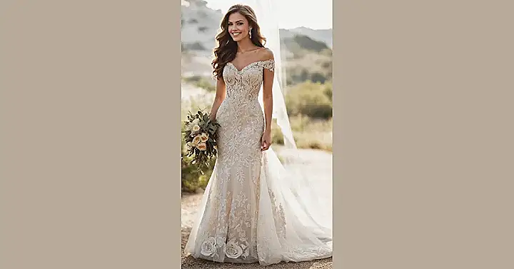 Wow, check out a dress that’s truly ready for its close-up! This isn’t just any gown; it’s a full-on sparkle fest that looks like it was woven from pure sunshine and dreams. With all those tiny beads catching the light, this beaded wedding dress takes “fancy” to a whole new level, making sure every single detail, from the delicate lace patterns to the shimmering off-the-shoulder sleeves, screams “main character energy.” You can practically hear the “oohs” and “aahs” from here as it perfectly matches that gorgeous, sun-kissed glow!