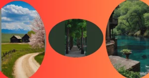 The road leads you towards a shimmering lake nestled at the foot of the mountains, and it looks like the perfect place for a picnic or just some quiet contemplation. And you know what else is cool? The trees are like giant, colorful umbrellas framing the whole scene, like they’re giving you a front-row seat to a breathtaking nature show. It’s like a real-life painting that you can walk right into!