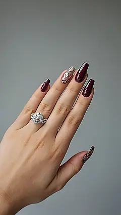 Burgundy nails are like a classic pair of jeans ‚Äì they always look good! In the picture, they’re giving off serious “I’m a total rockstar” vibes, especially with those cool rings. It’s like the nails are saying, “Hey, I’m sophisticated, but I’m not afraid to have a little fun.” And those rings? They’re the perfect accessories to add a bit of sparkle and personality to the look. The ring with the big, red gem is totally eye-catching, and the smaller, delicate ring adds a touch of elegance. Together, they create a style that’s both edgy and refined, just like the person wearing them.