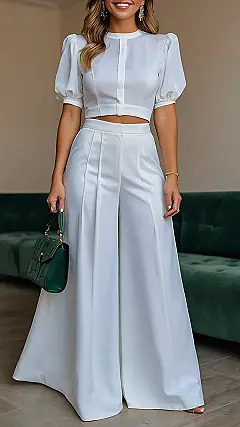 This outfit is like a breath of fresh air! The white top and pants are perfectly matched, with the top’s puffed sleeves adding a touch of playful elegance. It’s the kind of outfit that makes you feel confident and ready to take on the world, even if that world is just your high school hallway. The white colour is so versatile, you could totally wear this outfit to a party, a school dance, or even just to hang out with your friends.