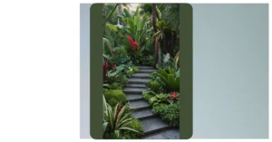 This garden is super fancy! Look at those stone walls, they’re like something you’d see in a castle! And the pathway? It’s like a royal red carpet leading to the front door. You can almost hear the sound of trumpets playing as you walk along it. Those big, beautiful plants look like they were hand-picked by a gardener who knows how to make a place look extra special. This garden is definitely for people who like things nice and classy.