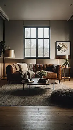 This living room screams “sophisticated chill”. It’s like the grown-up version of your friend’s messy but comfy room. You’ve got a huge, plush leather couch that looks like it’s begging you to sink into it with a good book and a cup of hot chocolate. It’s got that classic, almost timeless look that feels cozy and inviting, like it’s been styled by a grown-up who still knows how to have fun.