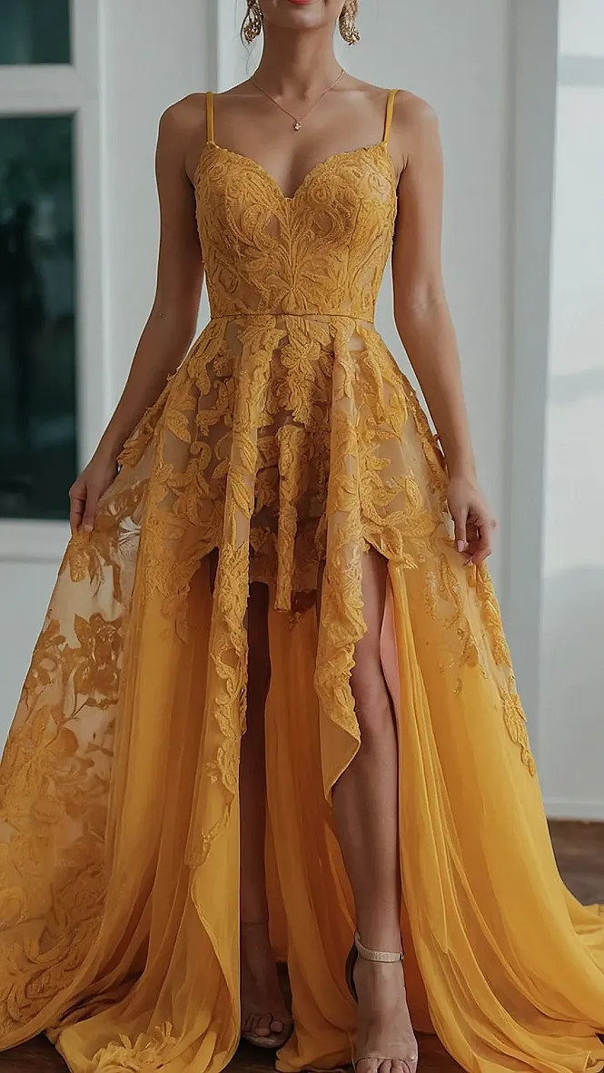 This dress is like sunshine bottled up in fabric! It’s a gorgeous, sunny yellow with a super-fancy lace design that makes it look like a fairytale princess costume. It’s a high-low style, which means the front is shorter and the back is long and flowy – like a magical, shimmering cape! Imagine twirling around in this dress at a party – all eyes would be on you! It’s definitely the kind of dress that makes you feel like you can conquer the world, or at least the dance floor.