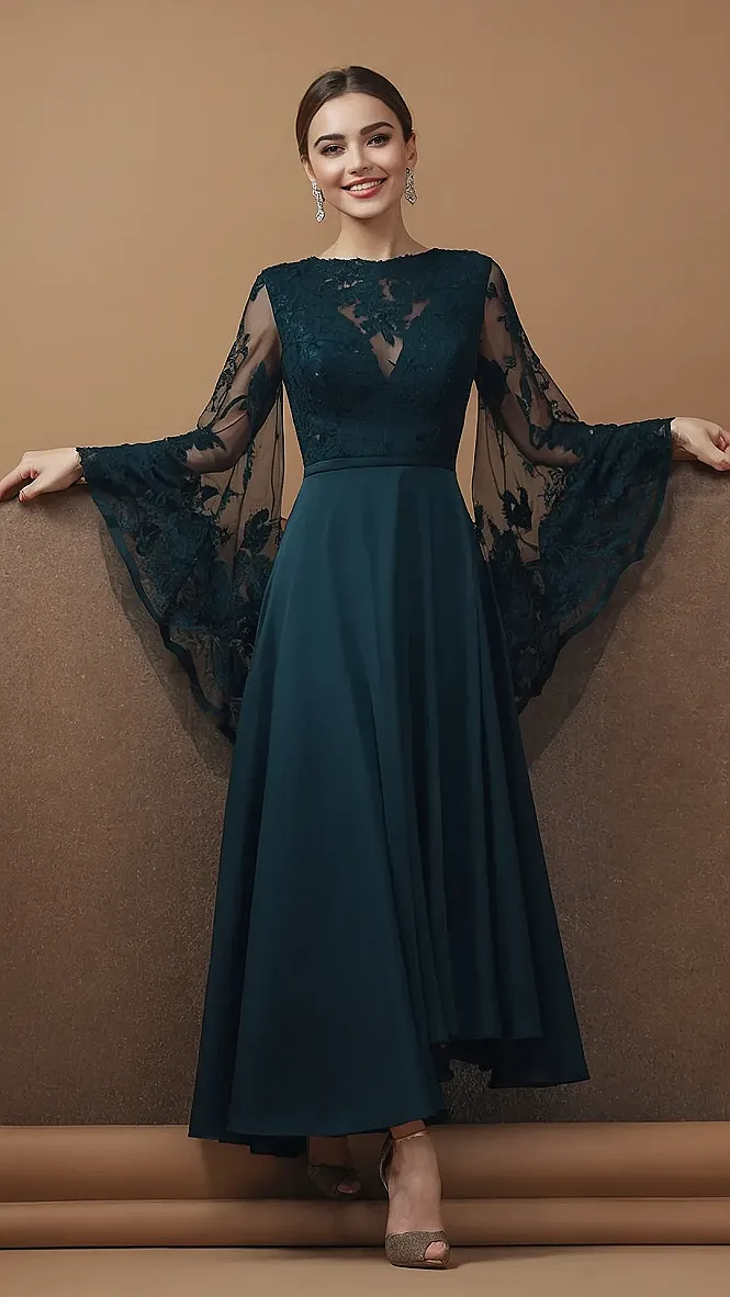 This dress is the ultimate party starter! It’s like a combination of a princess and a rockstar, with its super-flowy skirt and those awesome bell sleeves. Imagine dancing the night away in this dark green beauty, feeling like a total boss! The lace details add a touch of sophistication, so you’ll be the most stylish girl in the room.