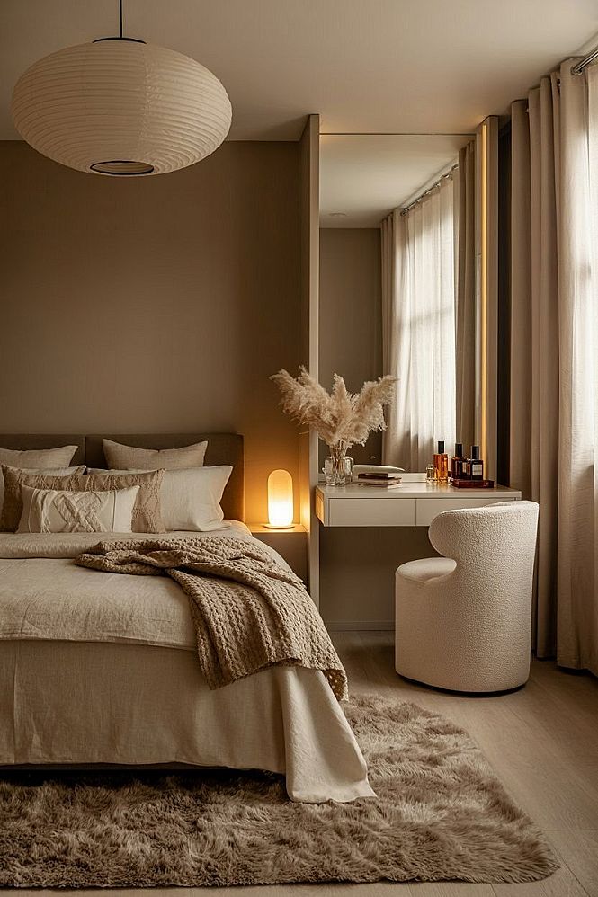 Discover a sophisticated beige room makeover perfect for small bedroom layouts, integrating a stylish vanity and office desk combo.