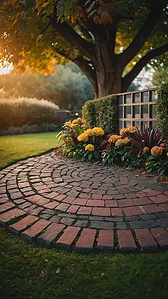 Imagine taking a stroll through a beautiful garden in the fall. The leaves are turning vibrant shades of red, orange, and yellow, and the air is crisp and cool. You’re walking on a brick path that leads you past colorful flowers, like those bright yellow ones in the picture. You can almost smell the sweet scent of autumn flowers and feel the soft, green grass beneath your feet.