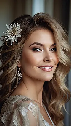 This picture shows a seriously gorgeous hairstyle perfect for a mom who wants to feel like a princess (or maybe just wants to steal the show at the school bake sale!). Those loose curls, the delicate flower—it’s the kind of look that says “I’m fabulous, and I know it,” without being too over-the-top. It’s the kind of hairstyle that would make even the grumpiest teenager do a double take.