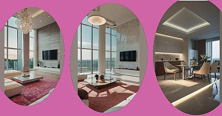 This room is so fancy, it’s like stepping into a cloud! Imagine sinking your toes into that fluffy pink rug, feeling like you’re walking on a marshmallow. The giant windows show off a beautiful sunset, making you feel like you’re in a magazine. Those big, round light fixtures look like they’re about to float away, and the whole place has a chill vibe that makes you want to relax and enjoy the view.
