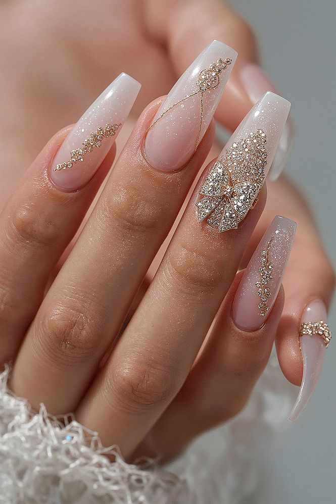 This design long nails style is a stunning choice for any spring nails gold celebration, ensuring a unique and luxurious look that’s perfect for the modern bride seeking statement-making wedding nails.