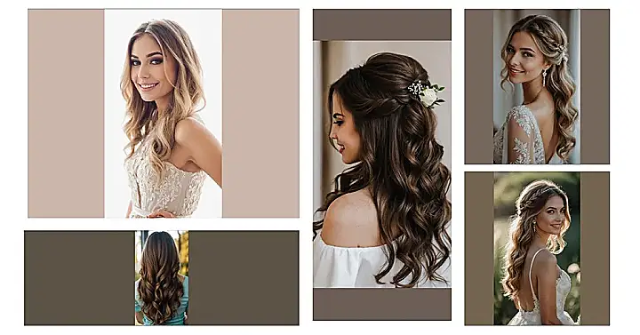 Picking a hairstyle for a daytime wedding isn’t just about looking pretty; it’s about making sure it stays put while you’re busy celebrating! Nobody wants their hair doing its own thing when the photographer is trying to get that perfect shot. A style like the one in the picture, where some hair is kept neat and away from the face while the rest is left beautifully curled, is super smart. It keeps you looking elegant and comfortable all day, from saying “I do” in the light to maybe even attempting some awkward dance moves later!
