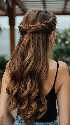 This hairstyle is the perfect mix of casual and glam, making it a total winner for homecoming! Imagine walking into the dance, looking like a total rockstar with your hair half up and half down. The loose waves add a touch of effortless cool, while the little twist at the top lets everyone know you put some thought into your look (without being too fussy, of course!). Think of it as the “I woke up like this” look, but way more polished and amazing.