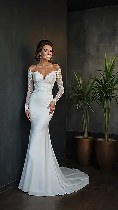 Talk about a dress that makes you want to spin around and maybe even break into a happy little dance! This stunning gown, with its elegant off-the-shoulder neckline and those absolutely dreamy lace sleeves, makes anyone look like they just stepped out of a fairytale. It’s the kind of dress where you glide, you sparkle, and you probably won’t even notice if you accidentally step on a few toes while showing off that beautiful train. And if it were crafted from sustainable organic cotton, you wouldn’t just be a vision, you’d be a planet-saving fashion icon!