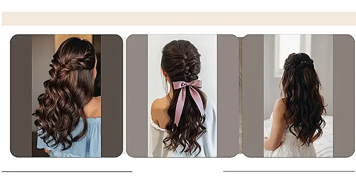 This picture shows a hairstyle that’s perfect for someone who wants to look fancy but still be comfy. The curls are super cute and flowy, and the braided part at the top is kinda like a crown. But the best part? The big, pink bow! It’s like a little party on your head! Imagine all the compliments you’d get with this look!