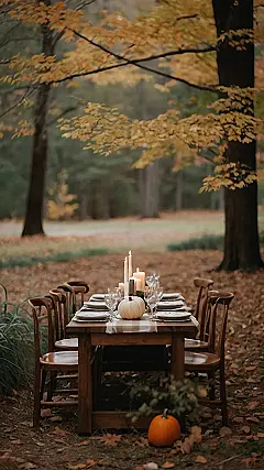 Imagine this: you’re sitting at a rustic wooden table, surrounded by the warm colors of fall. The leaves are turning golden and red, and the air is crisp. In front of you, a big, juicy pumpkin sits proudly next to a smaller one, like a pumpkin family enjoying a delicious dinner. There are candles burning, and the whole scene is glowing with a cozy, inviting charm. It’s a perfect picture of fall dining, and it makes you feel warm and fuzzy inside, even if you haven’t had any pumpkin spice latte yet.