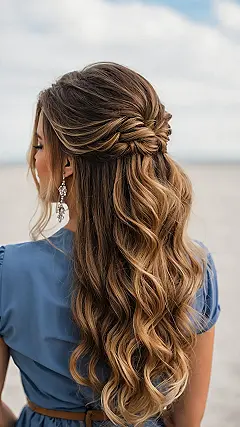While the top part is doing the heavy lifting and keeping things tidy, the ‘half down’ section is all about bringing the glam! Look at those gorgeous waves flowing down like a waterfall of awesome in the picture. This style lets you show off your length and those fancy curls, making sure you look absolutely stunning in every single photo – even the blurry ones your bestie takes at 2 AM. It’s like getting the best of both worlds: party on top, celebrity status on the bottom!