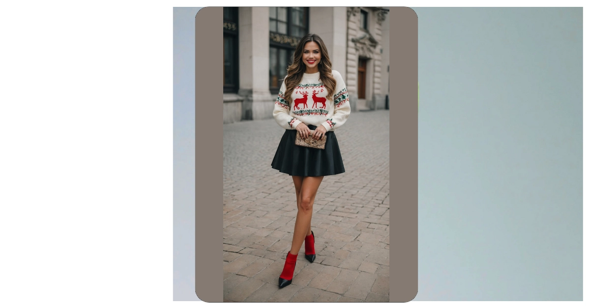 But wait, there’s more! It’s not just the sweater doing all the heavy lifting. Pairing it with a sleek black mini-skirt instantly levels up the whole vibe, making it less ‘fireplace cocoa’ and more ‘holiday party chic.’ And those red and black ankle boots? They’re a total power move, perfectly tying into the sweater’s colors and giving the whole outfit an extra pop of awesome. This ensemble isn’t just wearing a Christmas sweater; it’s confidently rocking one, ready to sleigh the day (pun absolutely intended!) whether you’re heading to a festive hangout or just conquering your to-do list with holiday flair.