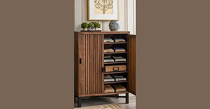 This isn’t your grandma’s wooden cabinet! Check out this stylish storage unit – it’s like a secret agent’s hideout for all your awesome home decor items. Imagine all the wooden treasures you could stash away – maybe a collection of miniature wooden animals, a quirky wooden clock, or even a set of handcrafted wooden coasters. The fluted design is super cool, and those little shelves are begging to be filled with your personal wooden masterpieces!
