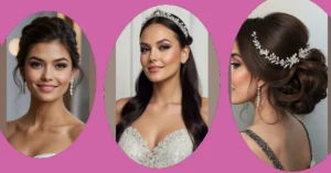 And as if those stunning curls weren’t enough, check out the awesome accessories! Tucked into the side are delicate white roses, fresh green leaves, and sparkling, blingy pieces that catch the light like tiny stars. It’s like your hair decided to wear its own fancy jewelry for the big day, adding that extra touch of magic and making the whole look perfectly picture-ready. This hairstyle is definitely ready for its close-up, ensuring the bride looks absolutely radiant from every angle!