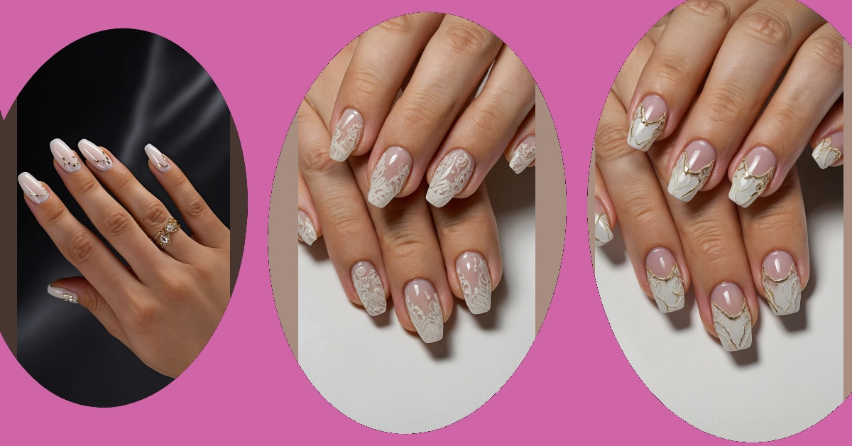 Who knew your nails could look so deliciously creamy, like a fancy vanilla milkshake, but without the sticky mess? These ‘milky nails’ are giving off serious ‘effortlessly chic’ vibes – the kind that make people wonder if you just effortlessly rolled out of bed looking this good. And just when you thought they couldn’t get any cooler, bam! A whole fashion show of intricate lace detail decides to throw a party on your fingertips, making them look totally high-fashion and ready for their close-up. It’s like your nails are rocking a fancy outfit for a major event, but they’re also down for a chill movie night.