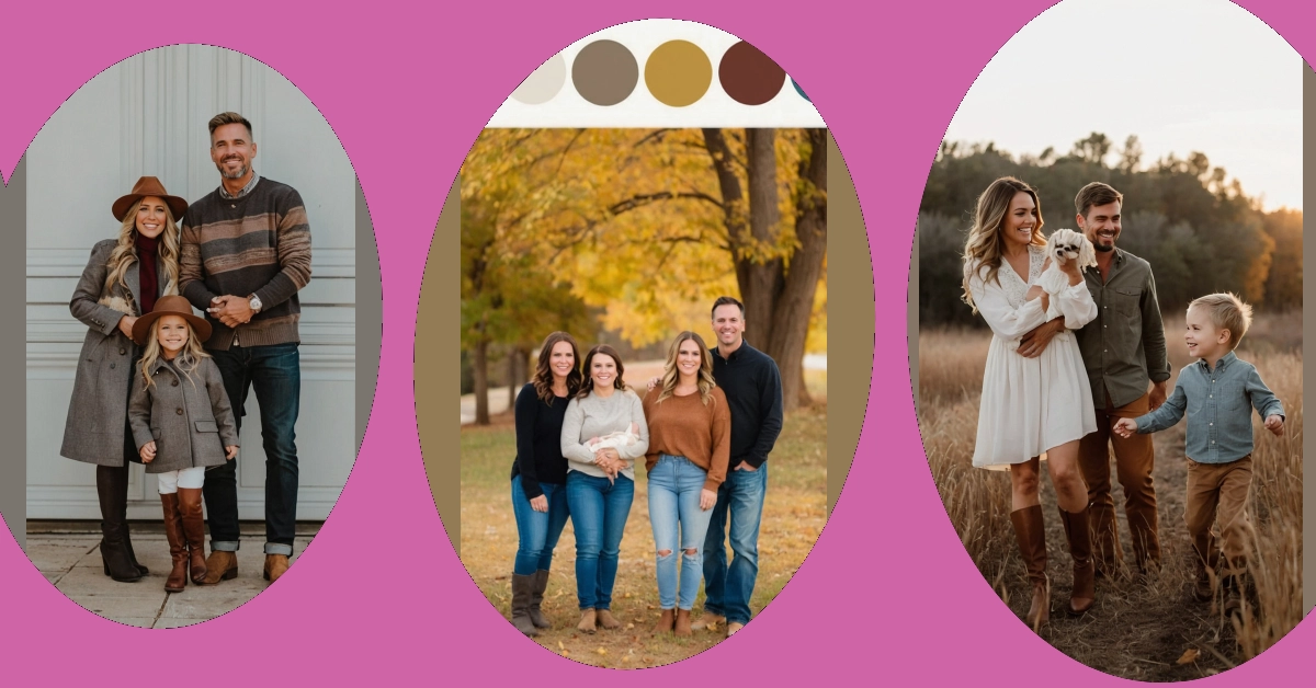 There are a few colors that are repeated, which is super important for making your photos look amazing. The soft browns and beige will give that warm fall feeling, and the little bit of blue keeps things fresh and fun. You could even get creative and add some fall foliage in your pictures! That way, you’ll have a beautiful background that complements your outfits perfectly. Make sure to smile, everyone!