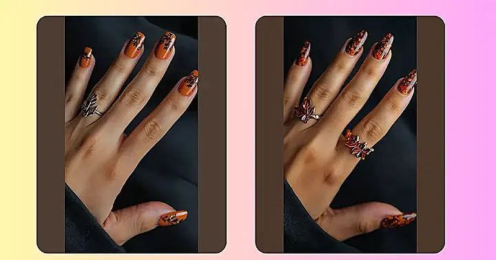 And check out those rings! They’re the perfect complement to the fall-themed nails, with a subtle touch of nature. It’s like this person is ready to rake leaves and go apple picking in style! Overall, it’s a totally cute and trendy look for the season!