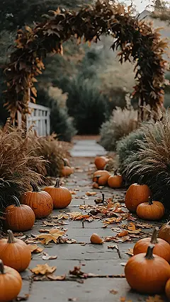 This picture is like a magical pathway leading you straight into the heart of autumn! Just imagine walking down this path, crunching fallen leaves under your feet, with the smell of pumpkin spice in the air. It’s like a real-life version of a fairytale, except instead of a prince charming, you have a whole bunch of adorable pumpkins!