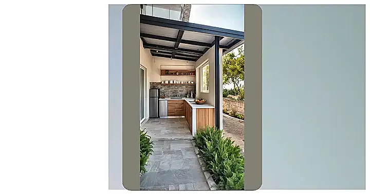 Who needs a giant mansion when you can have this slice of paradise right outside? This spot is basically telling your indoor kitchen, “Bye, Felicia!” because everything you need for a killer outdoor party is right here. Imagine whipping up snacks or grilling burgers without missing a single sunny moment. You’ve got a fridge for your secret stash of cold drinks and a counter that’s perfect for all your fruit-bowl masterpieces. Plus, with the lush green shrubs right there, you’re practically cooking in a mini jungle, but way less buggy and much more stylish!