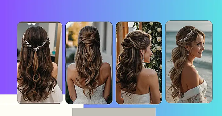 Let’s start with the classic half up half down styles. This look strikes the perfect balance between elegant and casual, making it ideal for both indoor and outdoor weddings. You can add some curls for texture or keep it sleek, whether you have straight hair or slightly wavy tresses. And since half up half down styles can be tailored to thin hair as easily as to thicker locks, they truly are a versatile go-to.