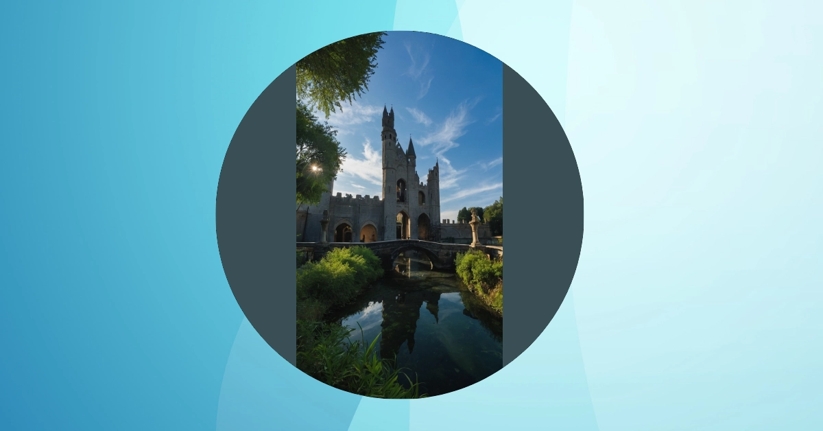 This picture makes you feel like you’ve stepped into a fairytale! It shows a beautiful, old bridge over a calm river, with a mysterious building on the other side. The bridge looks like something straight out of a movie, with its arched shape and stone walls. It’s almost like you could imagine knights and princesses crossing it on their way to a grand castle!