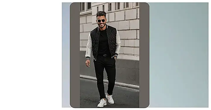 Check out this guy! He’s walking down the street like he just won an award for ‘Most Stylish Human,’ and honestly, with an outfit this sharp, he probably deserves one. He’s rocking a sleek black turtleneck and dark pants, keeping it super smooth. But the real MVP? That two-tone puffer jacket with the white sleeves, making sure he stays warm while looking cooler than a polar bear wearing sunglasses. And don’t even get me started on those sparkling white sneakers – seriously, how does he keep them so spotless?