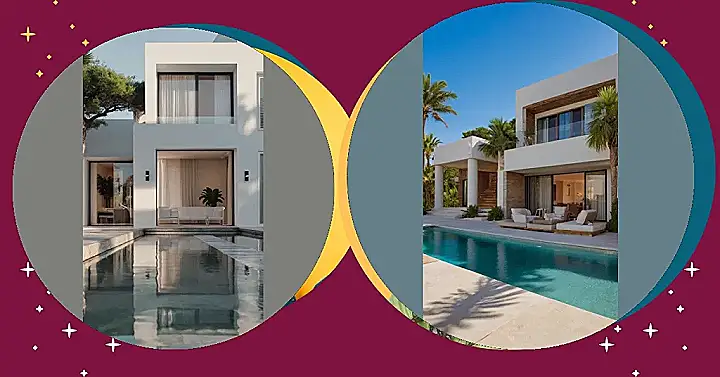 This villa is like something out of a magazine! It’s so modern and sleek, with huge windows that let in all the sunlight. It’s like living in a giant glass box, but in a good way. And the best part? That pool! It looks so refreshing and inviting. I bet it’s the perfect spot to relax and escape the heat, maybe even with a juicy magazine and a cold drink in hand.