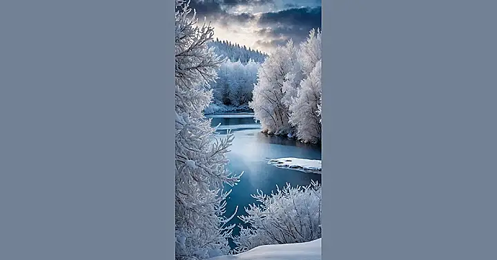 This scene right here is basically what happens when Mother Nature decides to put on her fanciest winter outfit and pose for a picture. Those trees are absolutely loaded with snow and frost, looking like they just got a serious sugar-coating, and the river sparkles with an icy blue that’s almost too pretty to be real. It’s the kind of view that screams ‘winter wonderland’ and definitely makes you want to cozy up with a hot chocolate, admiring it from your screen as the perfect new winter wallpaper.