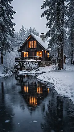 And check out that water! It’s like the stream is playing copycat with the cabin, perfectly mirroring all those warm, glowy lights. It’s so peaceful, you can almost forget it’s probably freezing cold outside and that water is basically a giant, super-smooth ice rink waiting to happen. This view is so good, it should come with a built-in blanket and a promise that you don’t have to put on five layers just to go outside. Definitely the kind of winter wallpaper that makes your phone screen feel a little bit warmer, even if your fingers are still numb.