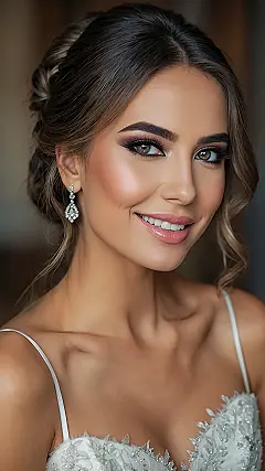 You know you’ve hit peak glam when your earrings are practically casting their own spotlights, just like the amazing sparkly ones in this photo! Her entire look screams “radiant” without actually yelling, “Hey, I spent ages perfecting this!” From the perfectly sculpted cheekbones that look like they’ve been kissed by a unicorn, to the shimmering eyeshadow that makes her eyes pop more than popcorn at a movie night, it’s clear this bridal makeup is designed to make anyone feel like royalty. And that little smile? Pure joy, probably because she knows her makeup artist totally nailed it and now she’s ready to walk down the aisle looking like a real-life filter.