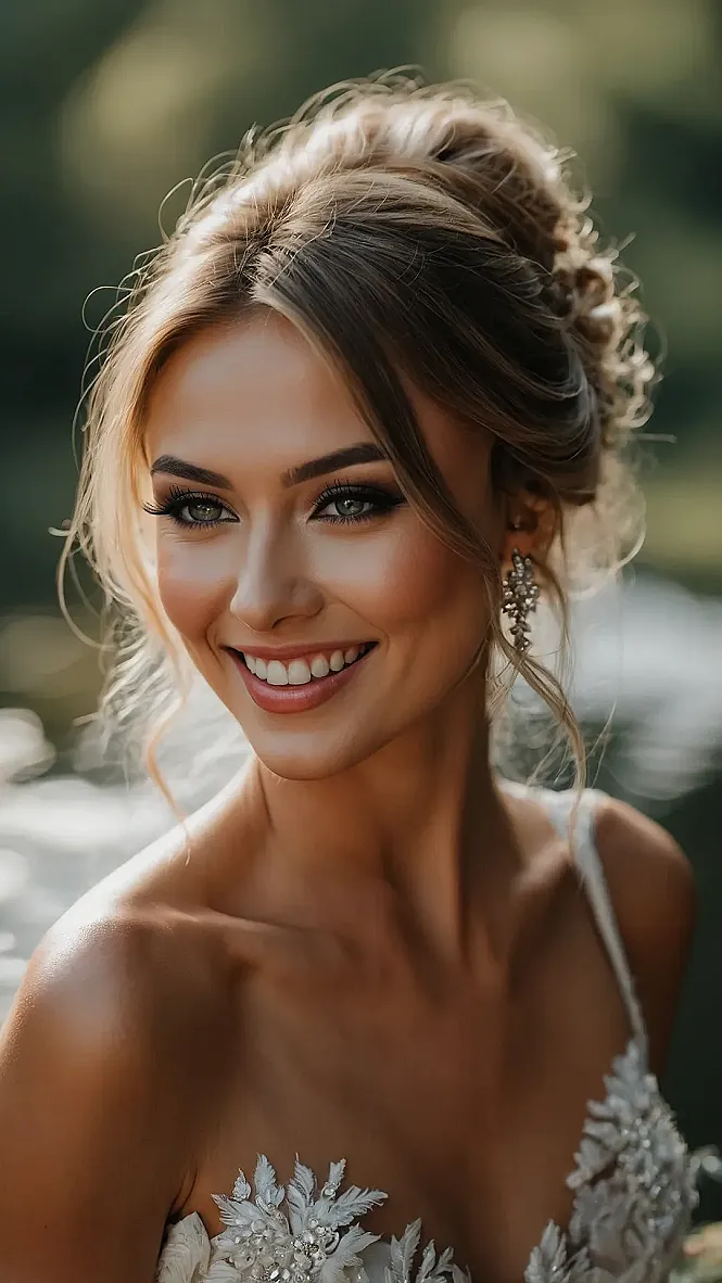 And while those eyes are definitely stealing the show, the rest of this bridal glow-up is just as epic! From the smooth, glowing skin that looks airbrushed (but totally real, we swear!) to the soft, glossy lips ready for ‘I do’ kisses, every detail is perfectly blended. Plus, that super cute sparkly headband? It’s like the cherry on top of this magnificent beauty sundae, making sure you feel like royalty without needing a full-blown crown. It’s truly a look that makes you feel ready to conquer the wedding aisle and maybe even impress a few aliens with your glow!