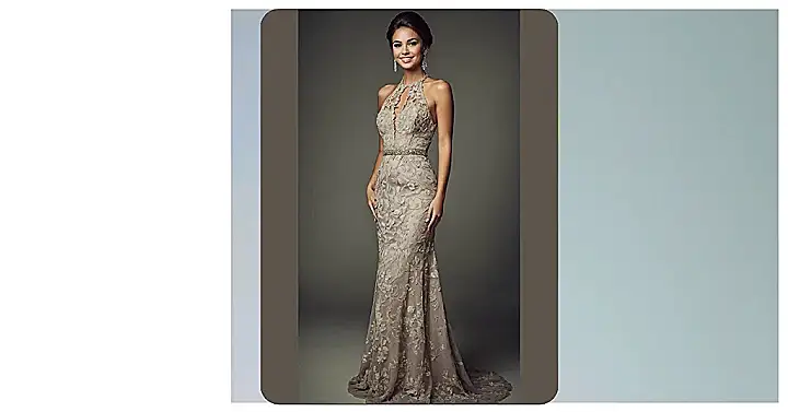 Whoa, talk about a golden moment! This dress is seriously shining brighter than your future after acing that history test. This classy, tight golden gown looks like it was poured right onto her, making her totally stand out against those cool, hilly shapes in the background. It’s got that sleek, “I’m ready for anything” vibe, whether that’s a fancy school dance or just looking amazing while pretending those are actual desert dunes she’s casually posing on. Plus, that big smile just completes the whole “effortlessly fabulous” look!