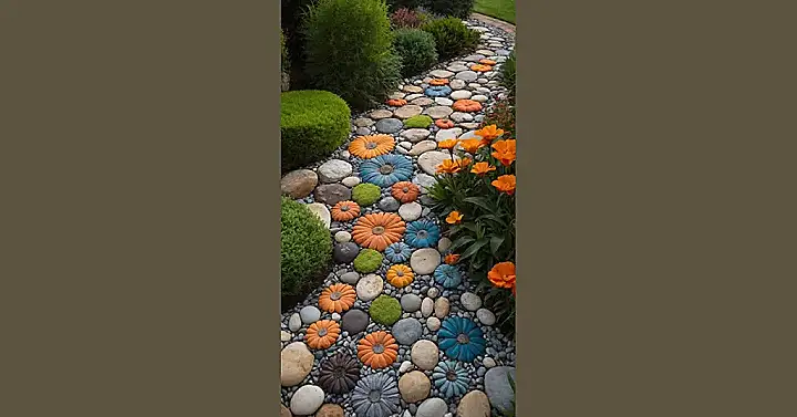 Step right up and feast your eyes on this garden path that clearly never skipped leg day for its creative side! It’s like someone decided a regular rock pathway was way too dull and decided to sprinkle it with giant, colorful flower-shaped candies or maybe even super comfy, plush stepping stones for an extra bouncy walk. Who needs plain old concrete when you can have a vibrant explosion of orange, blue, and green peeking out from a bed of pebbles? This isn’t just a walkway; it’s a cheerful runway for butterflies, maybe a chill zone for a very artistic garden gnome, or just a fantastic way to make sure your feet are always smiling.