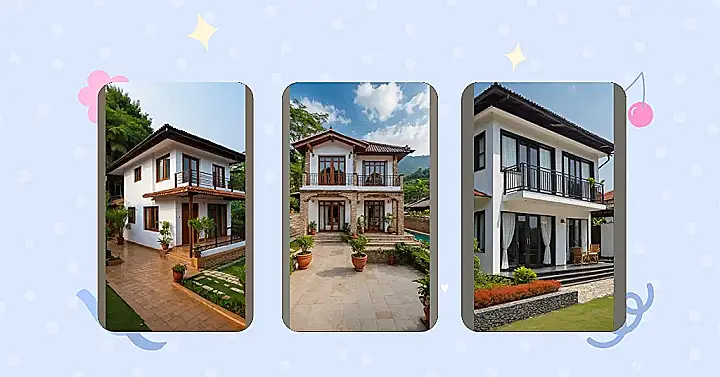 This place definitely redefines ‘village house design’. Forget tiny cottages and chickens trying to crash dinner; this looks more like a tropical getaway spot. It’s got that classic roof tile look, but the rest is all bright white walls and smooth wooden windows, looking super neat. It’s the kind of village house that probably has Wi-Fi that actually works and maybe even a pool hidden around the back, far from any confused cows.