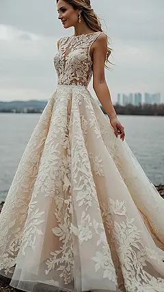 The best part? All the lace and detailing looks like someone painted fancy floral designs onto the dress. It makes you want to twirl, even if you’re terrible at dancing, and it will definitely look amazing in all the wedding photos. Just try not to spill anything on it!