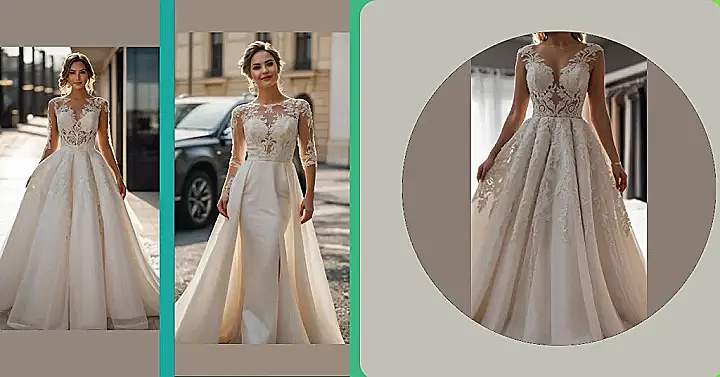 You know how some wedding dresses look like they weigh a ton? This one doesn’t! It looks light and comfy, perfect for celebrating all day and night. Plus, the little details like the lace and sparkly belt give it that extra touch of glam. This dress definitely screams “happily ever after,” and it’s proof that fairytales totally *can* come true!