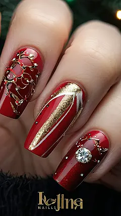 Seriously, these nails are so festive they practically sing carols! The rich, shimmery red is like the perfect Christmas candy, and those gold accents are like little snowflakes dancing across your fingertips. Just picture yourself reaching for a delicious cookie or opening a present with these – they’ll be the star of the show, stealing the spotlight from even the fanciest of wrapping paper. You’ll be ready for all the holiday fun and photo opportunities!