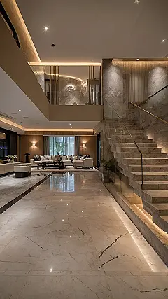 This living room looks so incredibly fancy, I’m pretty sure my messy backpack would spontaneously combust if I brought it in here. It’s got those super high ceilings and shiny surfaces that make you feel like you should probably be wearing a tuxedo, even if you’re just grabbing a snack. You know it’s a classy place when even the throw pillows look like they went to finishing school, and I bet a crumb has never dared to fall on that pristine rug.