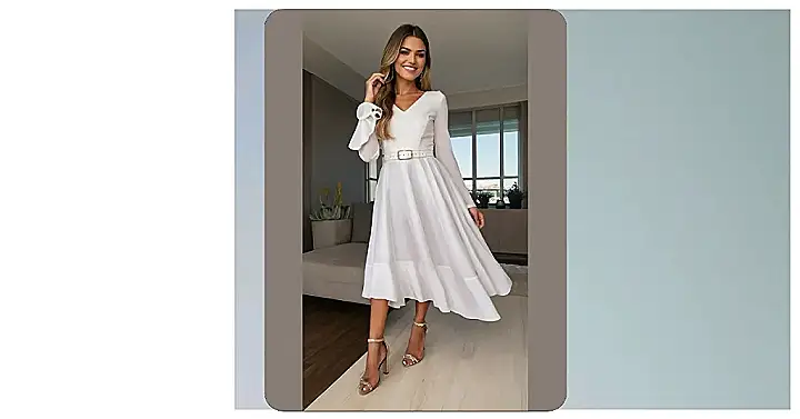 This dress is the perfect blend of elegant and fun – kind of like a fancy pizza with extra sprinkles! It’s white, which is totally classic, but the flowy skirt and those adorable bell sleeves give it a playful, modern twist. Imagine twirling around on the dance floor – this dress would make you feel like a princess (but a princess who’s ready to order some fries). You’ll be ready to conquer any date, whether it’s a fancy dinner or a casual stroll in the park.