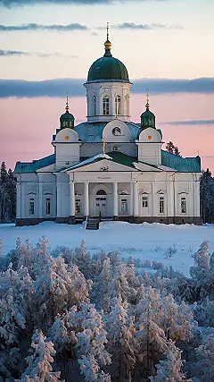 The building in this picture looks like it decided to go all-in on winter chic, getting completely covered in snow like it’s wearing a giant, fluffy white coat. Seriously, those green domes look like someone plonked huge scoops of mint ice cream on top, ready for the chill. It feels like you could step right into this frosty scene in Finland, where even the trees are sparkling like they’ve been dipped in sugar. It’s the kind of view that makes you want to grab a hot chocolate and maybe build a snow fort nearby, even if you’re just looking at it on a screen.