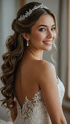 Picking an engagement hairstyle is kind of a big deal, because those pictures last forever, right? You want something that’s elegant but also feels like ‘you,’ and can survive all the hugging, posing, and happy tears. This half-up style is genius because it keeps some hair neatly off your face, letting that gorgeous smile shine, while still showing off those amazing long curls. Plus, that tiara isn’t just pretty, it’s probably secretly holding everything together so you don’t have a single hair crisis during your big announcement!